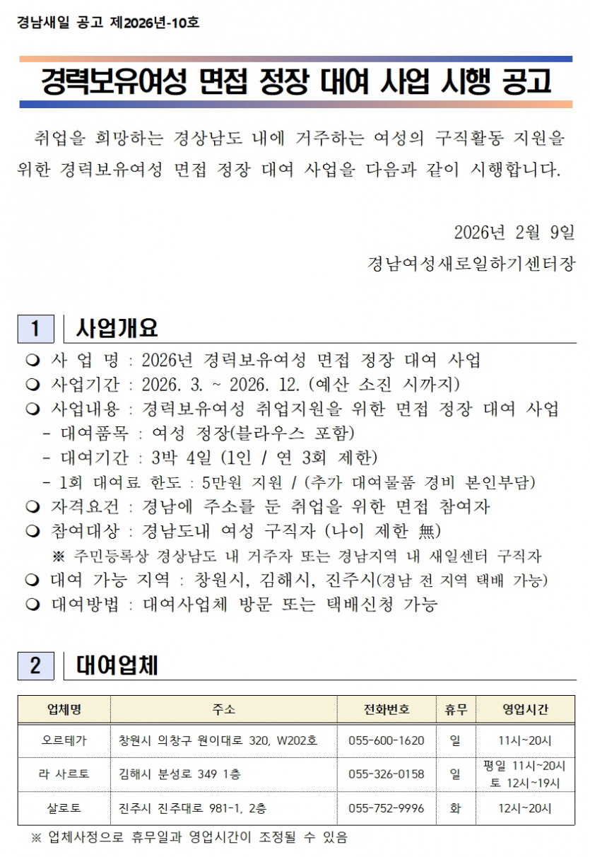 [경남새일 공고 제2026년-10호] 2026년 경력보유여성 면접 정장 대여 사업 시행 공고 > 공지사항