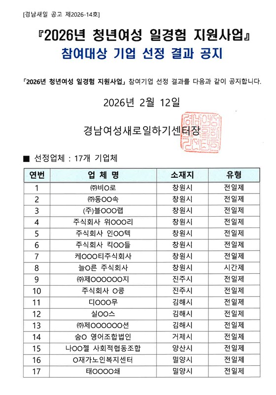 [경남새일 공고 제2026-14호] 2026년 지역주도형 청년일자리 사업 참여대상 기업 선정 결과