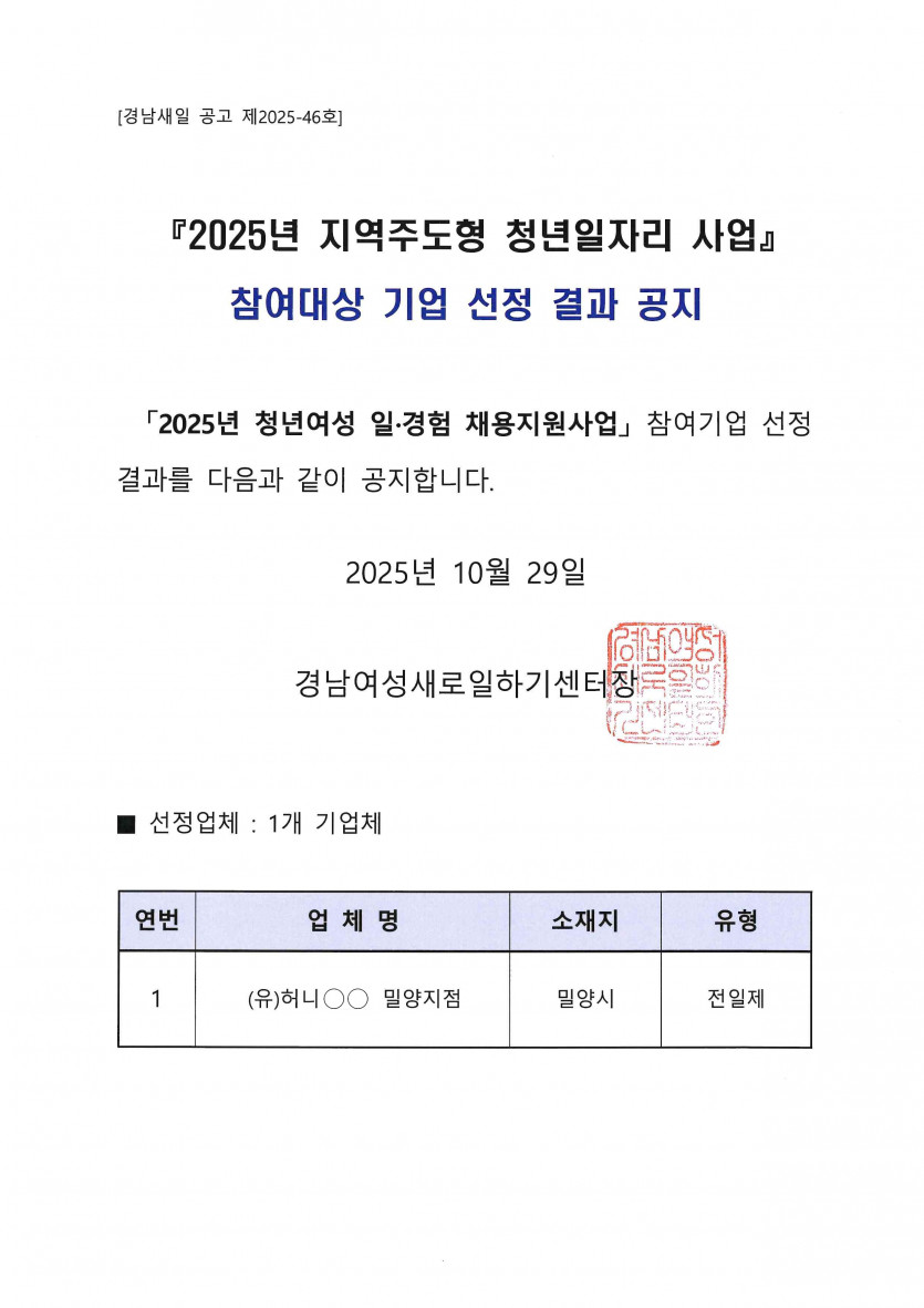 [경남새일 공고 제2025년-46호 ]2025년 청년여성 일경험 지원사업 참여기업 선정 결과 공지-밀양시 > 공지사항