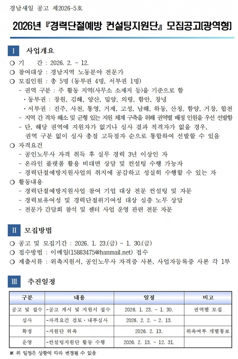 [경남새일 공고 제2026-5호] 2026년 『경력단절예방 컨설팅지원단』 모집공고(광역형)