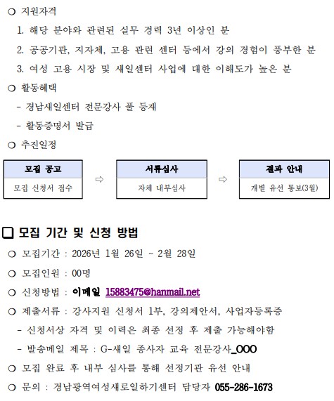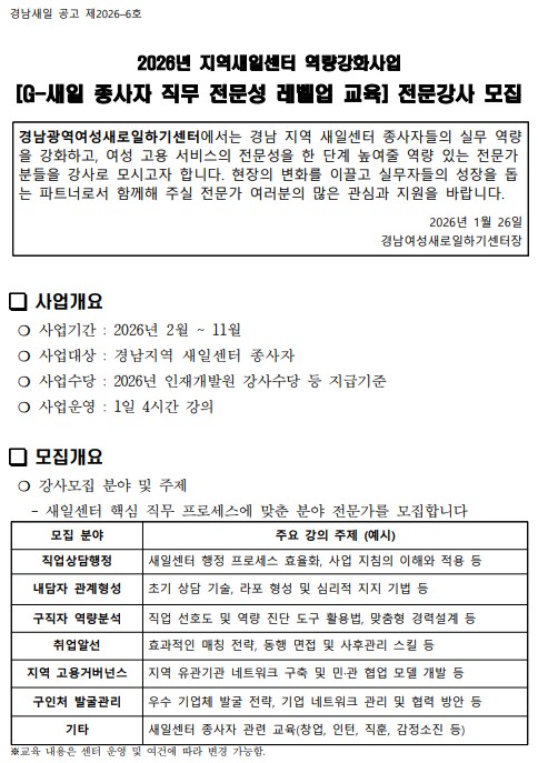 [경남새일 공고 제2026-6호] 2026년 G-새일 종사자 직무 전문성 레벨업 교육 전문강사 모집