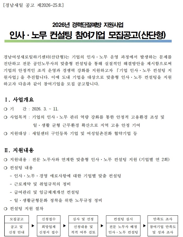 [경남새일 공고 제2026-25호](경남새일-산단형)2026년 인사·노무 컨설팅 참여기업 모집공고