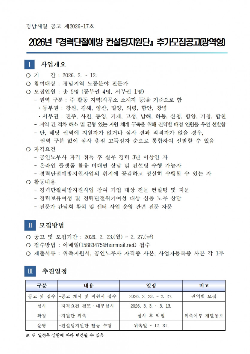 [모집마감] [경남새일 공고 제2026-17호] 2026년 『경력단절예방 컨설팅지원단』 추가모집공고(광역형) > 공지사항