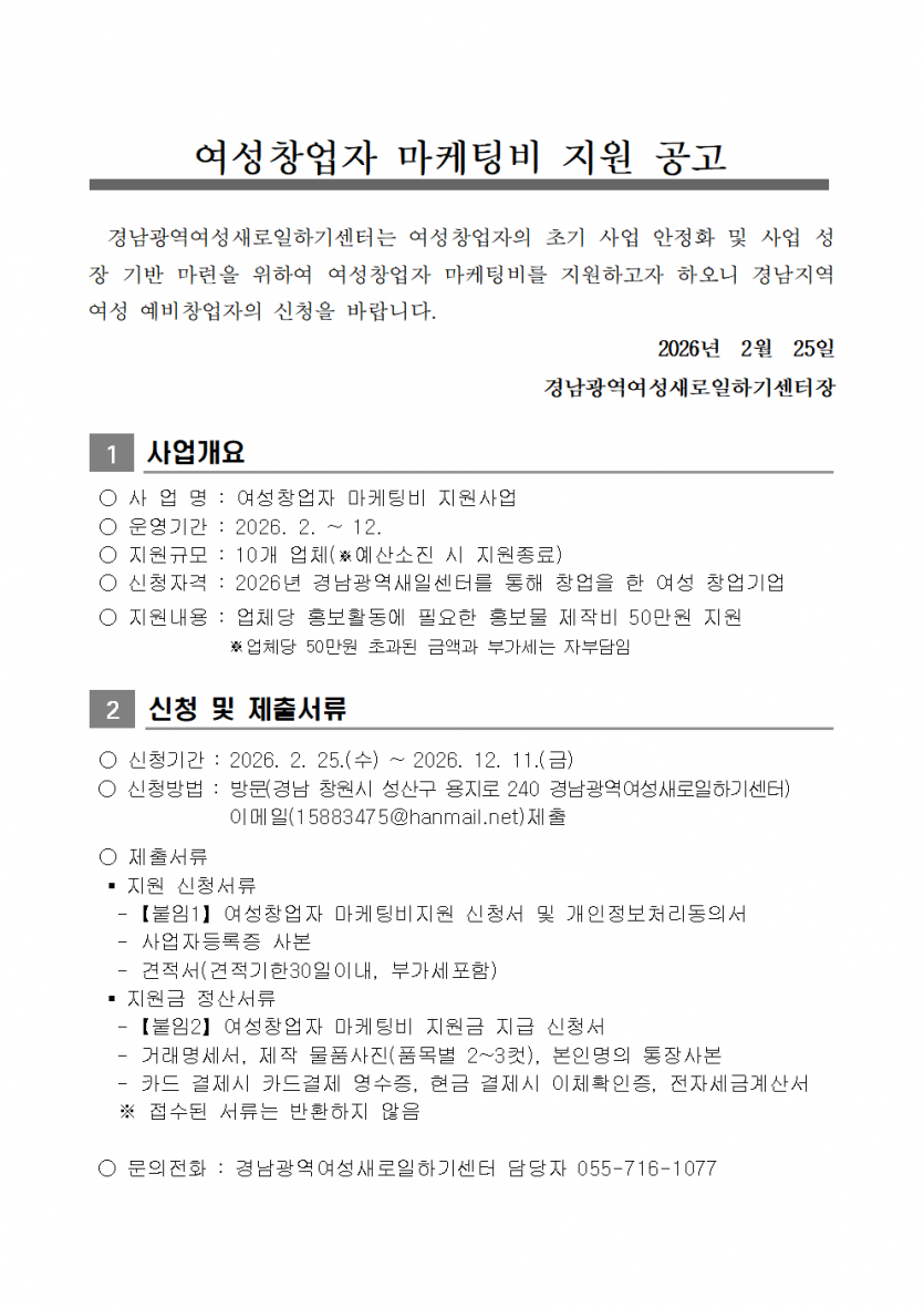 [창업] [경남새일 공고 제2026-20호] 2026년 여성창업자 마케팅비지원 공고 > 공지사항