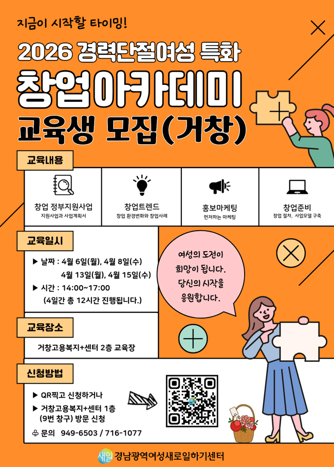 [창업][경남새일 공고 제2026-41호](경남광역) 경력단절여성 특화 창업아카데미 1차(거창)