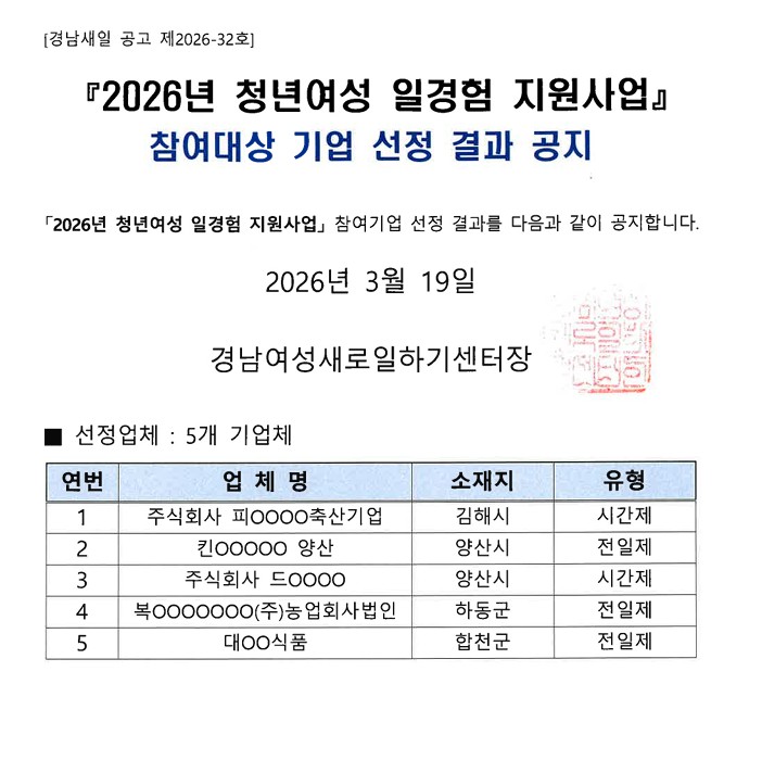 [경남새일 공고 제2026-32호] 2026년 지역주도형 청년일자리 사업 참여대상 기업 선정 결과