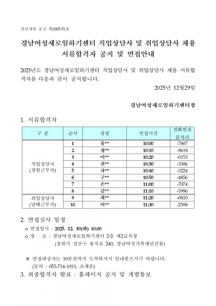 [경남새일 공고 제2025-51호] 2025 경남새일센터 직업상담사 및 취업상담사 서류합격자 공지 및 면접안내