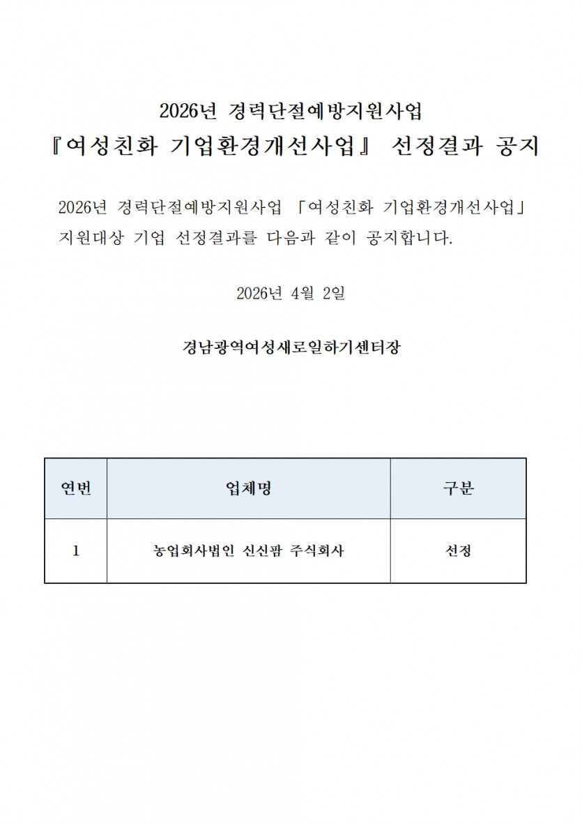 [경남새일 공고 제2026-39호] (경남광역) 여성친화 기업환경개선사업 -선정결과 공지