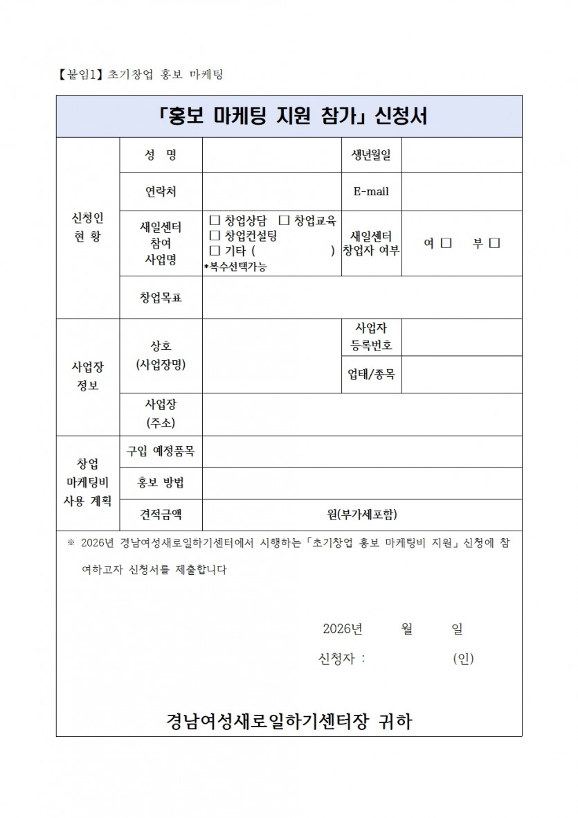 [경남새일 공고 제2026년-12호] 초기창업 홍보 마케팅비 지원 (예비)여성 창업자 모집 공고