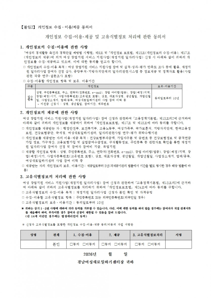 ① 회원으로 가입하여 서비스를 이용하고자 하는 자와 구직등록을 하여 취업알선을 받고자 하는 자는 경남여성새로일하기센터에서 요청하는 제반정보를 제공하여야 합니다.